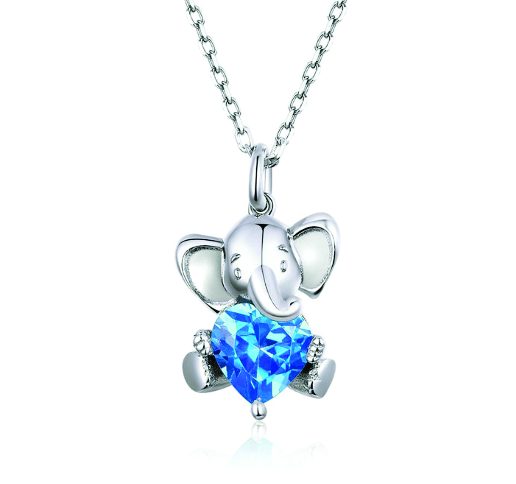The pendant is a baby elephant holding a blue Cubic Zirconia heart .